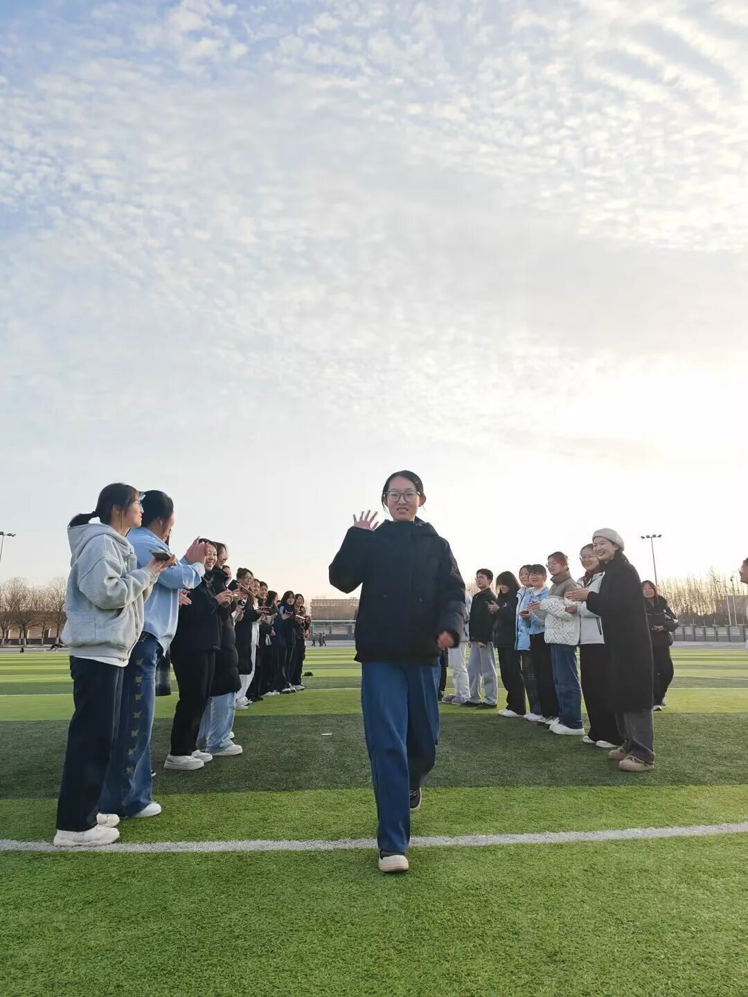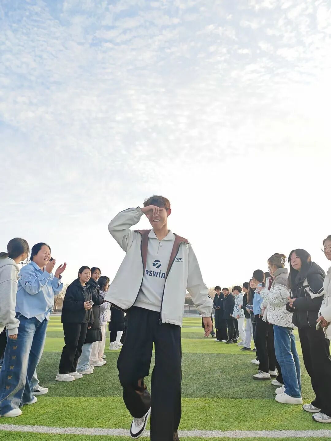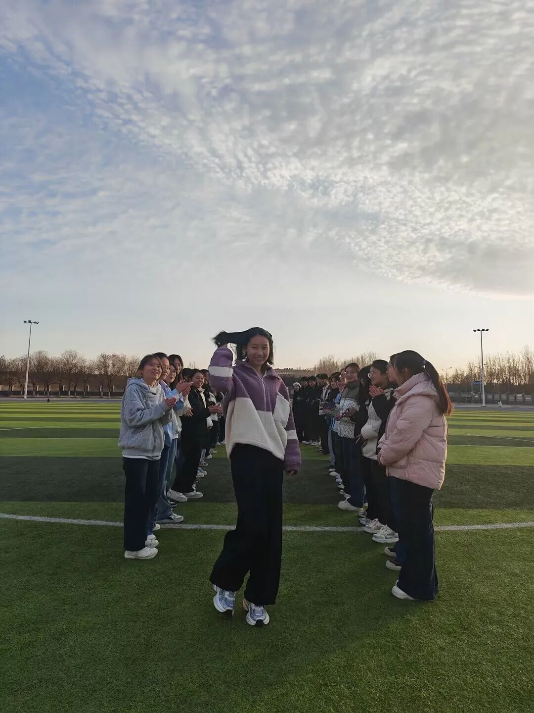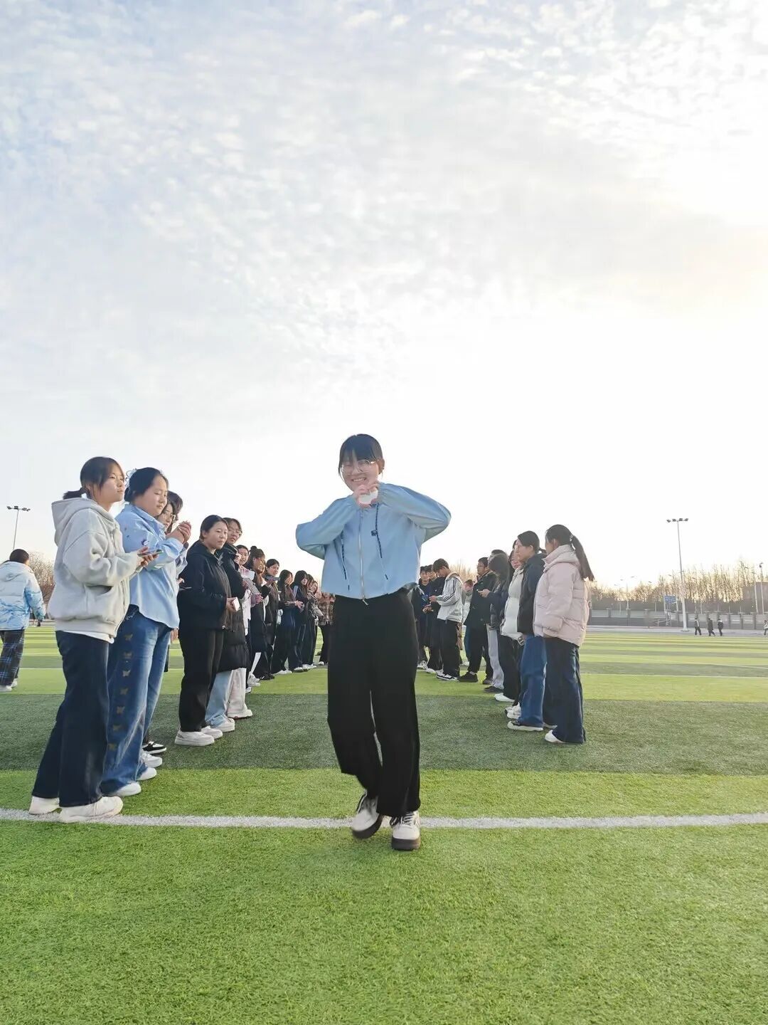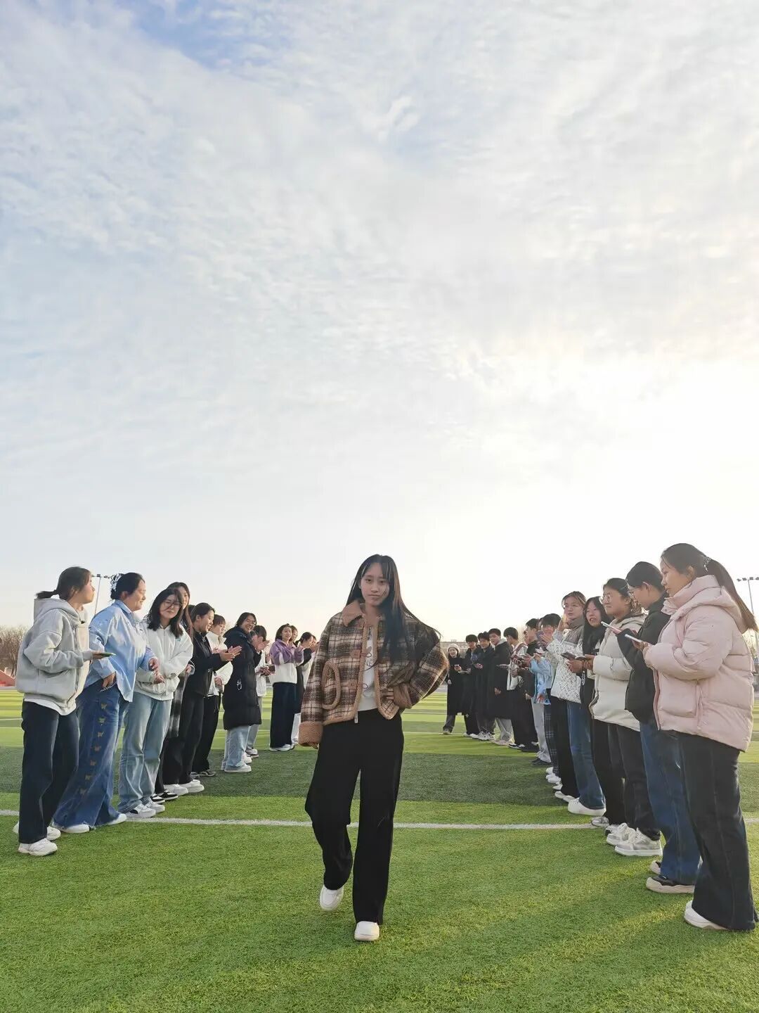 随后的“活力走秀”环节,绿茵场成为展示自我的舞台。同学们用双手搭起“拱门”,为走过的同伴加油鼓励。轻松的步伐、灿烂的笑容,每一次展示都在诠释勇敢,每一次掌声都在践行欣赏。