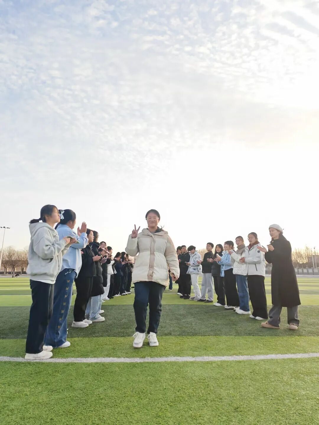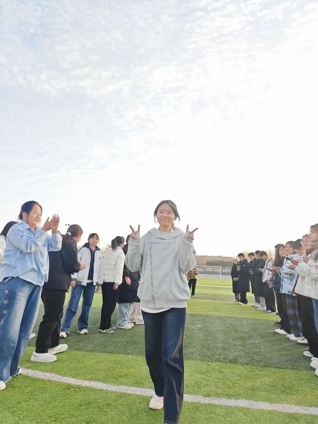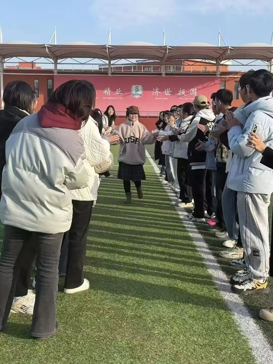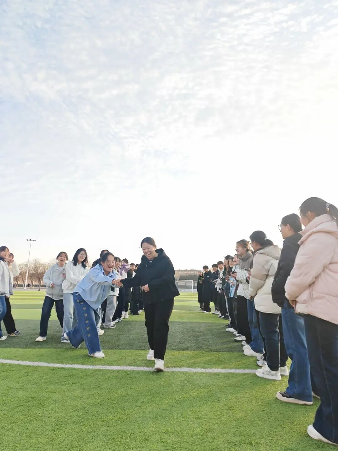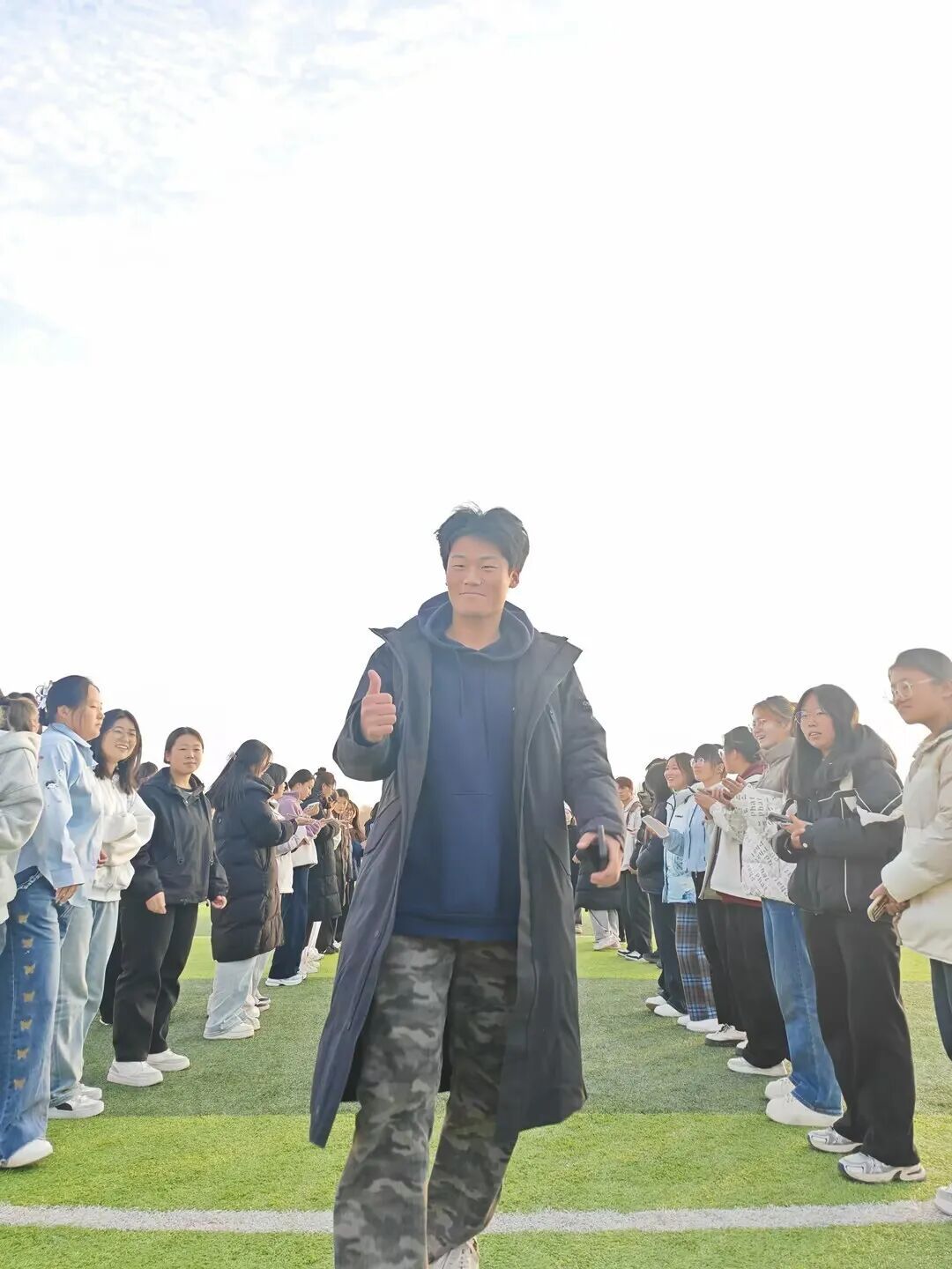 随后的“活力走秀”环节,绿茵场成为展示自我的舞台。同学们用双手搭起“拱门”,为走过的同伴加油鼓励。轻松的步伐、灿烂的笑容,每一次展示都在诠释勇敢,每一次掌声都在践行欣赏。