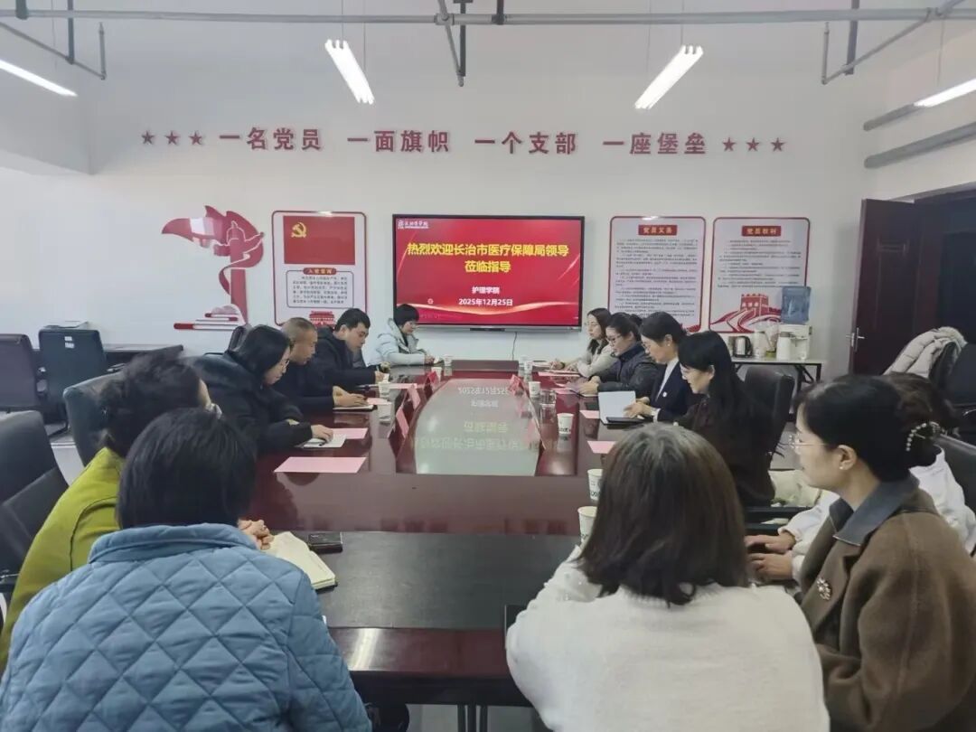 2025年12月25日上午,长治市医疗保障局医药服务科科长韩军率科员田亚运、冯亮亮一行3人,在校发展规划部校地合作办公室主任刘杰英陪同下,赴长治医学院护理学院开展长期照护师培训体系建设专题座谈。会议由护理学院副院长赵文婷主持,学院党政领导班子成员及培训教师代表参加。