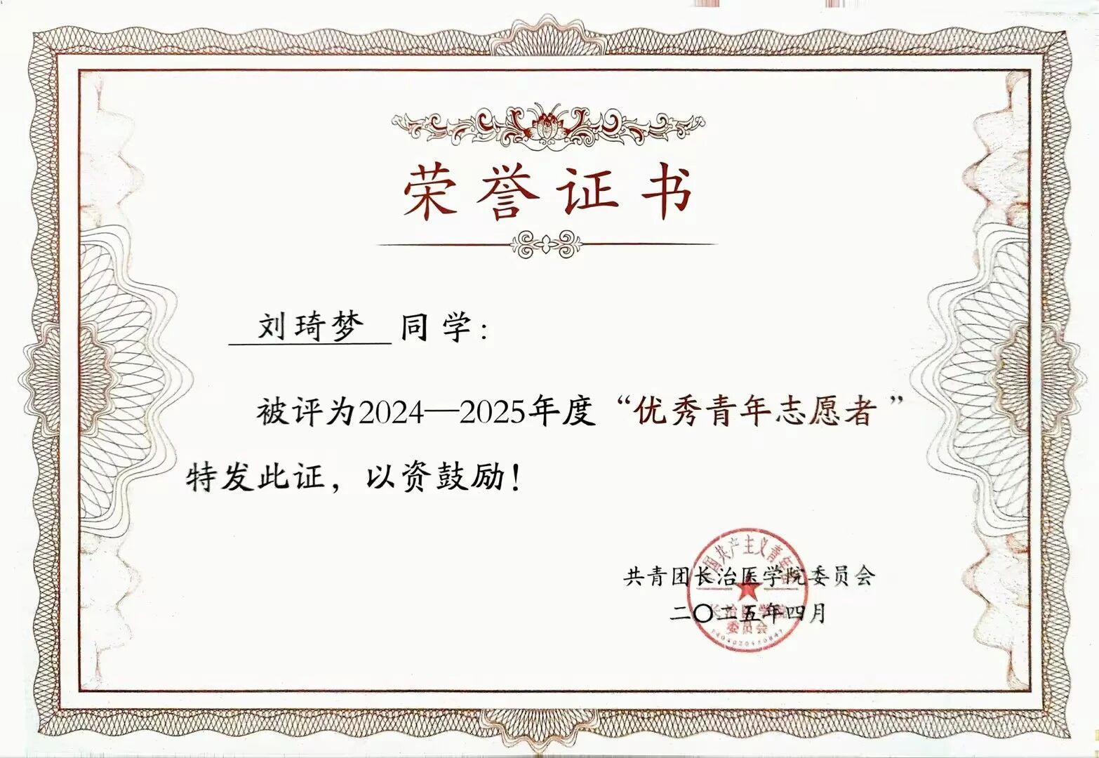 长治医学院五四“优秀青年志愿者”