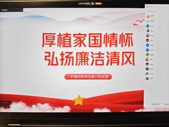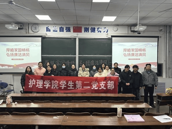 为深入贯彻全面从严治党要求,大力弘扬廉洁自律优良作风,引导党员厚植家国情怀、筑牢思想防线,护理学院学生第二党支部于1月5日在校本部南区11教开展“厚植家国情怀 弘扬廉洁清风”主题党日活动,支部全体党员参与其中。