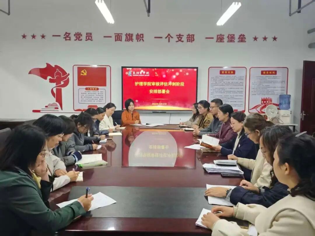 为确保本科教育教学审核评估高标准通过,全力冲刺倒计时18天的关键阶段,10月18日下午,护理学院召开审核评估冲刺工作专题会议。会议由护理学院院长陈爱香主持,学院领导班子、教研室主任、全体专职教师、辅导员共同参加。